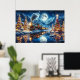 Uma bela imagem aquática de uma cena noturna de inverno com uma locomotiva a vapor vintage chegando a uma estação adornada com luzes festivas de Natal. A neve coberta o chão e os telhados, e o pano de fundo apresenta montanhas em direção a montanhas sob um céu estrelado com uma lua de cheio. O brilho quente da luz do comboio e as luzes cintilantes criam uma atmosfera de férias convidativa e acolhedora, evocando sentimentos de nostalgia e celebração associados à época de Natal.