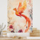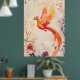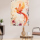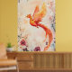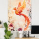 Assunto: Uma fênix vibrante com plumagem laranja e vermelha flamejante voando entre galhos.