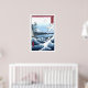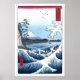 Poster japonês com uma pintura Ukiyo-e reconstruída mostrando uma vista do Monte Fuji do Satta Point na Baía de Suruga, com ondas quebradas em primeiro plano. Esta impressão de Woodblock foi criada pelo artista japonês Hiroshige Ando 1797-1858