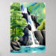 Pintura aquosa de uma cascata em cascata. Uma paisagem com pedras e árvores.