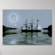 SmudgeArt creation"pirate Cove" in blue tones. This stunning ship is anchoring in a cove on a bright full moon night, the water is clear and crisp showing full reflections of the ship and surroundings.