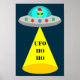 Esta maravilhosa poster de Natal apresenta uma imagem de arte digital de uma espaçonave de alienígena decorada com luzes de Natal brilhantes e coloridas. Dentro o OVNI olhando pela janela há uma alienígena verde com olhos pretos vestindo um chapéu festivo de Santa. Há um cone de luz vindo do disco voador. A sombra de uma mensagem está sendo projetada para a Terra. A mensagem diz Ho Ho OVNI. Cartões de natal do espaço exterior para todos os terremotos.