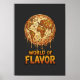 Cartoon Earth as a giant dripping pizza, with distressed text: “World of Flavor.”