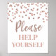 Placa de ajude-se para chá de bebê, chá de noiva, festa de aniversário ou casamento em um padrão de confete dourado rosa.