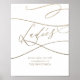 Este sinal de banheiro feminino de caligrafia dourada romântica é perfeito para um casamento simples. O design clássico moderno apresenta redemoinhos extravagantes e floreios caprichosos com tipografia dourada falsa de champanhe, elegante e manuscrita. A placa lê "Damas, por favor, sirvam-se, cumprimentos dos recém-casados".