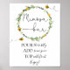 Placa de bar Mimosa com uma grinalda de aquarela de folhagens e flores amarelas com abelhas zumbindo e as palavras Bar Mimosa em um script de caligrafia divertido.
