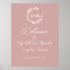 Um simples e elegante sinal de boas-vindas cor-de-rosa com monograma de folha de floração falsa para chá de casal. Fácil de personalizar com seus detalhes. Sinal de boas-vindas moderno boho para chá de casal editável, personalizável, fonte manuscrita caligráfica, simples, elegante.