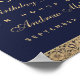 Um design retrô para um casamento elegante. O fundo é azul-marinho. Possui bordas douradas florais com decorações intricadas de rosas silvestres. A ocasião e o nome estão escritos em uma fonte caligráfica elegante, o restante em letras maiúsculas. Todo o texto pode ser personalizado e tem uma cor dourada semelhante às rosas douradas nas bordas. A mensagem de boas-vindas é um texto arqueado acima da idade.