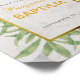 Este elegante desenho de batismo tem folhas verdes de salgueiro em torno de uma moldura de folha de ouro falso com interior de mármore branco, contendo o texto Acima do texto, parcialmente em um triângulo na parte superior da moldura, há uma cruz de folha de ouro falso. O nome é escrito em uma fonte caligráfica elegante, o restante em letras maiúsculas. O nome e a ocasião são dourados, o restante do texto é cinza. O fundo é de mármore branco.