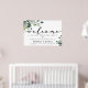 Moderno simples e elegante com caligrafia "bem-vindo" e placa de casamento com folhagem verde de eucalipto.