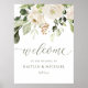 Placa de Boas-Vindas de Casamento Elegante - Buquê de Folhagem Floral Branca: Dê as boas-vindas aos seus convidados de casamento com esta placa de 45 x 60 cm! Esta placa apresenta um lindo buquê em aquarela com flores brancas, folhagem e um toque de brilho dourado falso. O lindo "boas-vindas" é feito em uma fonte de caligrafia moderna que complementa perfeitamente o design!