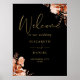 Esta elegante placa de boas-vindas de casamento floral rústica pode ser personalizada com suas informações em tipografia dourada elegante em um fundo preto. Criado por Thisisnotme©