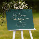 Dê as boas-vindas aos seus convidados com estilo com este elegante sinal de boas-vindas de casamento em esmeralda, apresentando um símbolo de coração de corda dourada e uma fonte de caligrafia moderna. O rico fundo de tom de joia adiciona um senso de sofisticação atemporal, perfeito para casamentos no jardim, locais internos elegantes ou celebrações de destino.