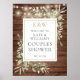 Com belas luzes de corda e delicadas folhas de greenery em aquarela sobre um fundo de madeira rústica, esta placa de boas-vindas de chá de noiva chic pode ser personalizada com suas iniciais de monograma dourado e informações especiais do chá de noiva. Projetado por Thisisnotme©