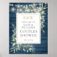 Com belas luzes de corda e delicadas folhas de verde aquarela em um fundo de madeira azul rústica, esta placa de boas-vindas de chá de noiva chique pode ser personalizada com suas iniciais de monograma dourado e informações especiais do chá de noiva. Projetado por Thisisnotme©