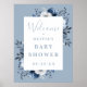 Esta elegante placa de boas-vindas de chuvada de bebê floral country azul poeira pode ser personalizada com suas informações em tipografia moderna. Desenhada por Thisisnotme©
