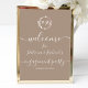 Um simples e chique letreiro de boas-vindas para festa de noivado em papelão espuma com monograma em folha falsa e folhagem grullo. Fácil de personalizar com seus detalhes. Letreiro de boas-vindas para festa de noivado moderno boho em papelão espuma editável, convite de casamento com foto e guirlandas, personalizável, fonte manuscrita caligráfica, simples, elegante.