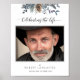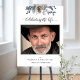 Meus pêsames pela sua perda. Honre seu ente querido com um delicado Cartão de Boas-Vindas de Foto de Funeral atencioso com um requintado desenho de folhagem pintado à mão em aquarela no topo e a frase "Celebrando a Vida de" em caligrafia moderna e graciosa. Variedade de tamanhos para escolher. Desenho de folhagem e pinheiro em tons de azul, azul-marinho, sage, cinza e verde. Livro de visitas, cartão de visitas, convite de Funeral/Celebração de Vida e programa disponíveis. Parte da nossa coleção de casamento e eventos "Rustic Blue Mountains".