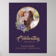 Elegante placa de boas-vindas de funeral/memorial floral roxa e dourada com moldura de foto dourada adornada com rosas em aquarela roxa e flores de respiro de bebê.