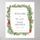 Dê as boas-vindas aos convidados para o seu chá de bebê com este belo cartaz, apresentando uma moldura dourada rodeada por folhas perenes de inverno, poinsétia, frutos de azevinho e folhagens. Adicione o nome da convidada de honra, data do chá e texto de boas-vindas personalizado usando os campos fornecidos.