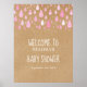 Lindas gotas de chuva cor-de-rosa caem em direção aos seus detalhes personalizados em um fundo rústico kraft boho, nesta placa de boas-vindas para chá de bebê menina, sprinkle ou chá de casal. Desenhado por Thisisnotme©