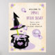 O amor está fervendo! Um letreiro de boas-vindas para chá de panela de bruxa com tema de Halloween em lilás claro e preto é mais doce do que assustador! A noiva lançou um feitiço no noivo. Um caldeirão transborda com corações e um misturador de madeira com um chapéu de bruxa adornado com rosas roxas. Um fundo com aparência de pergaminho e o caldeirão podem ser personalizados com as iniciais e monograma da noiva e do noivo. Arte © Chrissy H. Studios, LLC. Todos os direitos reservados.