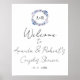 Fácil de personalizar com seus detalhes. Um simples e elegante sinal de boas-vindas com monograma em aquarela floral roxa e azul para chuveiro de casais. Sinal de boas-vindas moderno boho para chuveiro de casais editável, personalizável, fonte manuscrita caligráfica, simples, elegante.