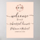 Um simples e chique cartão de boas-vindas para jantar de ensaio em papelão espuma com monograma em folha dourada rose e folhagens em cor de rosa pêssego. Fácil de personalizar com seus detalhes. Cartão de boas-vindas para jantar de ensaio moderno boho em papelão espuma editável, convite de casamento com foto e guirlandas, personalizável, fonte manuscrita caligrafada, simples, elegante.