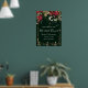 Placa de Boas-Vindas para Jantar de Rehearsal com Vegetação Invernal Elegante. Composição natalina de Poinsettia, folhas verdes de azevinho e bagas vermelhas, pinha e grinalda de luzes contra um fundo verde escuro.
