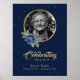 Placa de boas-vindas com foto para funeral elegante com flores azuis e douradas, apresentando uma moldura de foto dourada adornada com rosas azuis em um fundo azul. O fundo pode ser alterado para qualquer cor.