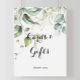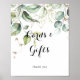 Esta placa de cartões e presentes de folhagens em ouro elegante é perfeita para um casamento moderno ou chá de noiva. O design apresenta folhas de eucalipto verdes botânicas e douradas desenhadas à mão, inspirando beleza artística.