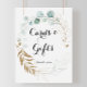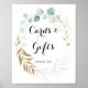 Este letreiro rústico de cartões e presentes florais dourados de eucalipto é perfeito para um casamento simples ou chá de noiva. Este design artístico apresenta flores douradas desenhadas à mão e folhagens verdes de eucalipto em aquarela, lindamente dispostas num quadro geométrico elegante.