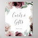 Este letreiro de cartões e presentes de romance floral é perfeito para um casamento elegante ou chá de noiva. O design moderno rústico boho apresenta flores românticas em aquarela em tons suaves de burgundy, mauve, rosa beije e branco creme com folhas verdes. A linha de texto na parte inferior do letreiro pode ser personalizada com a data, os nomes da noiva e do noivo, ou uma mensagem curta como "Obrigado". Este letreiro pode ser usado para um casamento ou qualquer evento ou festa.