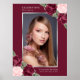 Elegante placa de boas-vindas de celebração da vida/funeral em aquarela vermelha e rosa, apresentando rosas vermelhas bordô e rosadas e flores de respiro decorando uma moldura de foto prateada. Itens correspondentes disponíveis.