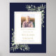 Uma elegante celebração da vida, placa de serviço memorial fúnebre com folhagem botânica em aquarela sobre um fundo azul marinho. Criado por Thisisnotme©