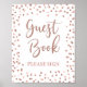 A placa de sinalização de chuveiro de livro de visitas por favor assine apresenta um belo design de confetes brilhantes em rose gold.