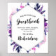 Placa de Flores Roxas e Prateadas Folhas Caules e Vinhas em Aquarela Geométrica Hexagonal Placa de Assinatura de Convidados com Texto ou Citação Personalizada