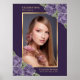 Elegante placa de boas-vindas de celebração de vida/funeral floral roxa com rosas roxas e flores de respiro decorando uma foto dentro de uma moldura dourada. Itens correspondentes disponíveis.