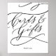 Este sinal de cartão e presente com floreio de caligrafia romântica é perfeito para um casamento simples ou chá de noiva. O design clássico moderno apresenta redemoinhos sofisticados e floreios caprichosos com uma tipografia elegante e escrita à mão. A linha de texto na parte inferior do sinal pode ser personalizada com a data, os nomes da noiva e do noivo, ou uma mensagem curta como "Obrigado". Este sinal pode ser usado para um casamento ou qualquer evento ou festa.