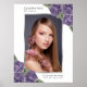 Elegante placa de celebração de vida/funeral com foto floral roxa, apresentando rosas roxas e flores de respiração de bebê decorando uma foto dentro de uma moldura prateada. Itens correspondentes disponíveis.