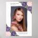 Elegante placa de boas-vindas de celebração de vida/funeral com flores roxas e rosadas e foto, apresentando rosas roxas e rosadas e flores de respiração de bebê decorando uma foto dentro de uma moldura prateada. Itens correspondentes disponíveis.
