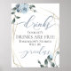 Flores em Azul Poeira para combinar com o tema do seu casamento, Placas engraçadas para o bar aberto na sua recepção - As bebidas desta noite são grátis, as histórias de amanhã não terão preço! . Rosas em aquarela, folhas e bagas em azul poeirento moderno e chique rodeiam uma moldura dourada em estilo terrário geométrico com folhagens verde-sage. Personalize o texto, o estilo da fonte, a cor e o tamanho. Arte original criada para a BarefootBride™ por © WhimsicalArtwork™ - Esta faz parte de uma Suite de Papelaria de Casamento completa com convites de casamento, chá de bebê e outros eventos.