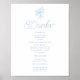 Cartão de Menu de Bebidas de Casamento em Azul Francês com delicada arte de hortênsias e tipografia serif refinada, uma peça de declaração de bar elegante para uma celebração atemporal.