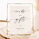 Este Cartão de Sinal de Presentes e Lembranças apresenta uma elegância minimalista moderna e bonita para exibir em seu chá de bebê, casamento ou evento especial. Edite facilmente a maioria das palavras para combinar com o seu evento! As cores do texto e do arco são totalmente editáveis —> clique no botão "Personalizar Mais" para editar!