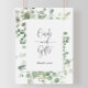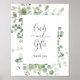 Esta placa de presentes e cartões de eucalipto verde minimalista é perfeita para um casamento moderno ou chá de noiva. O design apresenta ramos e folhas de eucalipto botânico elegante desenhados à mão com aquarela, adornando molduras geométricas.