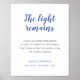 Este elegante sinal de memorial azul, com a tocante citação "A luz permanece" é uma maneira bonita de lembrar e homenagear o ente querido na reunião de Celebração da Vida. Personalize com seu texto na parte inferior.