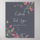 Esta placa de texto personalizado com flores silvestres azuis clássicas é perfeita para um casamento rústico ou chá de noiva. O design apresenta flores silvestres amarelas, roxas e brancas com folhagem em um fundo de aquarela rosa e verde.