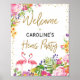 Linda placa de boas-vindas de festa de galinhas tropicais com ilustração de aquarela de mãe e bebê flamingo, flores vibrantes e letras em dourado falso. Este cartaz de boas-vindas é perfeito para chá de bebê temático de verão / tropical / havaiano / luau.