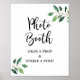 A placa 'CABINE DE FOTOS - PEGUE UM ADEREÇO E FAÇA UMA POSE' apresenta um belo design de caligrafia com folhagens para o seu casamento, chá de bebê ou festa.