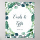 Esta placa de cartões e presentes de folhagem exuberante e eucalipto é perfeita para um casamento elegante ao ar livre ou chá de noiva. O design botânico moderno apresenta belo eucalipto azul aquarelado e folhas verdes. A linha de texto na parte inferior da placa pode ser personalizada com a data, os nomes dos noivos ou uma mensagem curta como "Obrigado". Esta placa pode ser usada para um casamento ou qualquer evento ou festa.